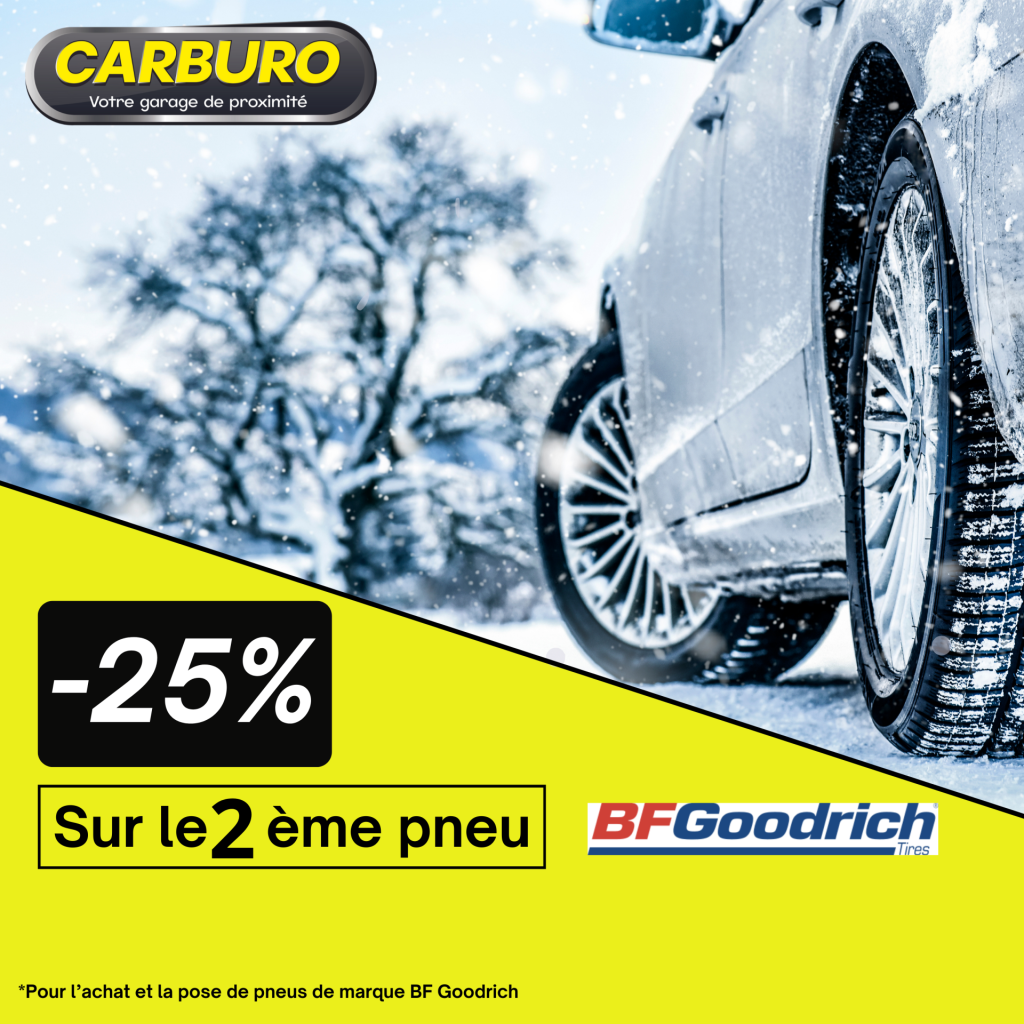 Du 1er janvier au 31 mars 2026, bénéficiez d’une remise de -25 % sur le 2ᵉ pneu de marque BF Goodrich pour tout remplacement de pneus dans notre atelier.
